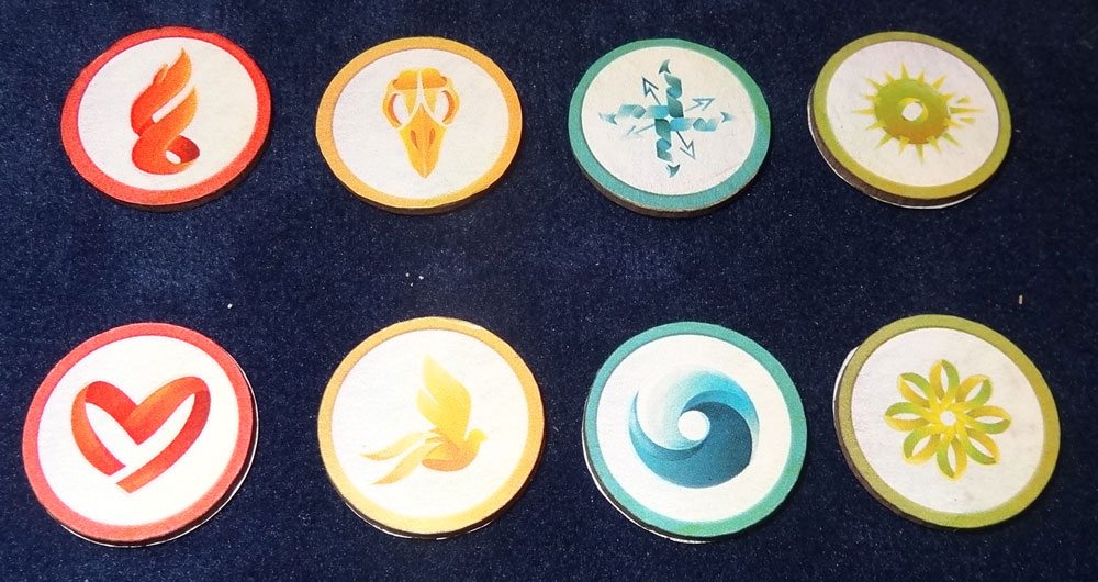 The game will include 8 spirits–these represent the players in the game. Each of the spirits has its own special ability. My prototype boards were not double-sided so I only had two for each faction, but you can see all of the spirits on the Kickstarter page. Not pictured here are Hatred, Love, Misery, and Delight.