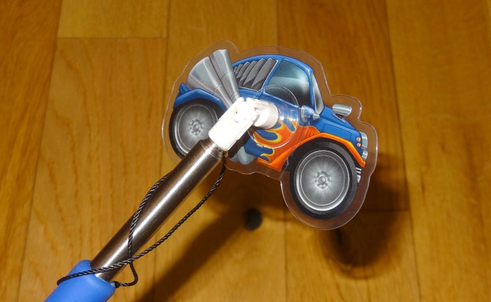 Loop the tether around the Jammer Stick a few times, and then stick the suction cup onto the Jammer. Extend the pole a bit, and then put the Jammer up against the window, and now you’ve got a character or vehicle that you can drive and fly around in the passing landscape! Because of the universal joint, you can twist the handle to make the Jammer rotate and do flips.