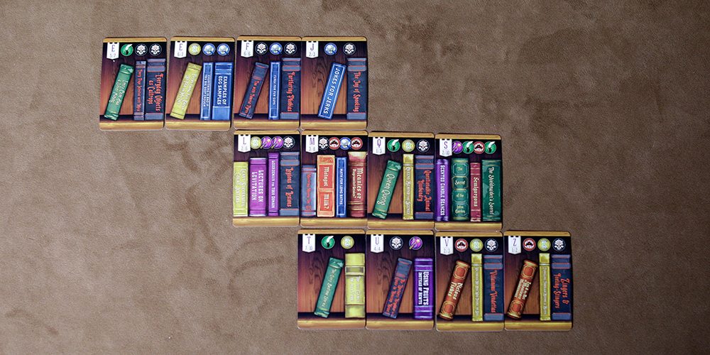 To play, first, you must understand how to score points in Ex Libris. All scoring in the game is generated from how you build your library and the first requirement is that all your books be placed in a grid in alphabetical order, from left to right and no higher than three rows tall. After placing your first card, every subsequent card must be placed orthogonally and touching an existing book card in your library. Additionally, cards must adhere to the numerical order rule. That is, as mentioned above, if there are seven cards featuring the letter “E” as the beginning letter and you have more than one, they must appear in numerical order, as well (i.e. 2/7, 5/7, 6/7). If at the conclusion of the game, any cards are out of order, cards in violation must be flipped to make an alphabetical order complete.