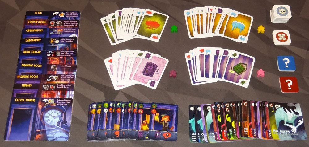 Note: my review is based on a Kickstarter prototype so component quality is not final. Art and design looks mostly finished, but can be subject to change—for instance, the card backs in my prototype do not match what’s shown on the Kickstarter page, and the wooden ghost markers may be changed from standard meeples to custom ghost shapes if stretch goals are reached.