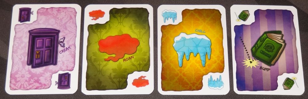 The scare cards each show a large symbol representing the scary things you can do as a ghost: a bouncing book for “bump,” a blue cloud with icicles for “chill,” and so on. The backs of the cards are all the same, but the fronts have different colored backgrounds so you can separate them out in the different player colors. The backgrounds also have different wallpaper patterns, making it better for color blind players as well.