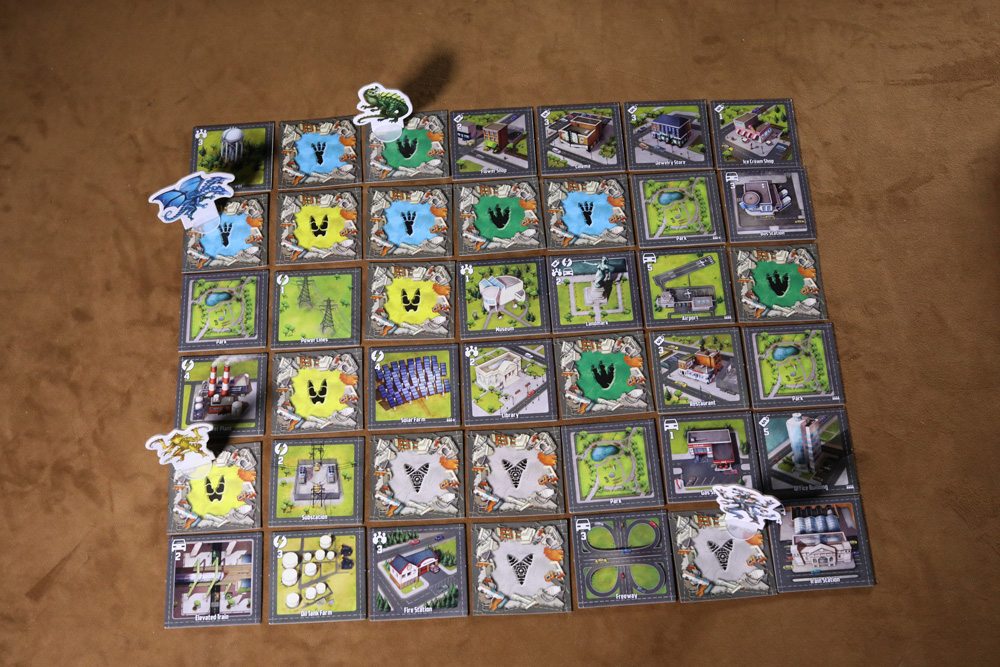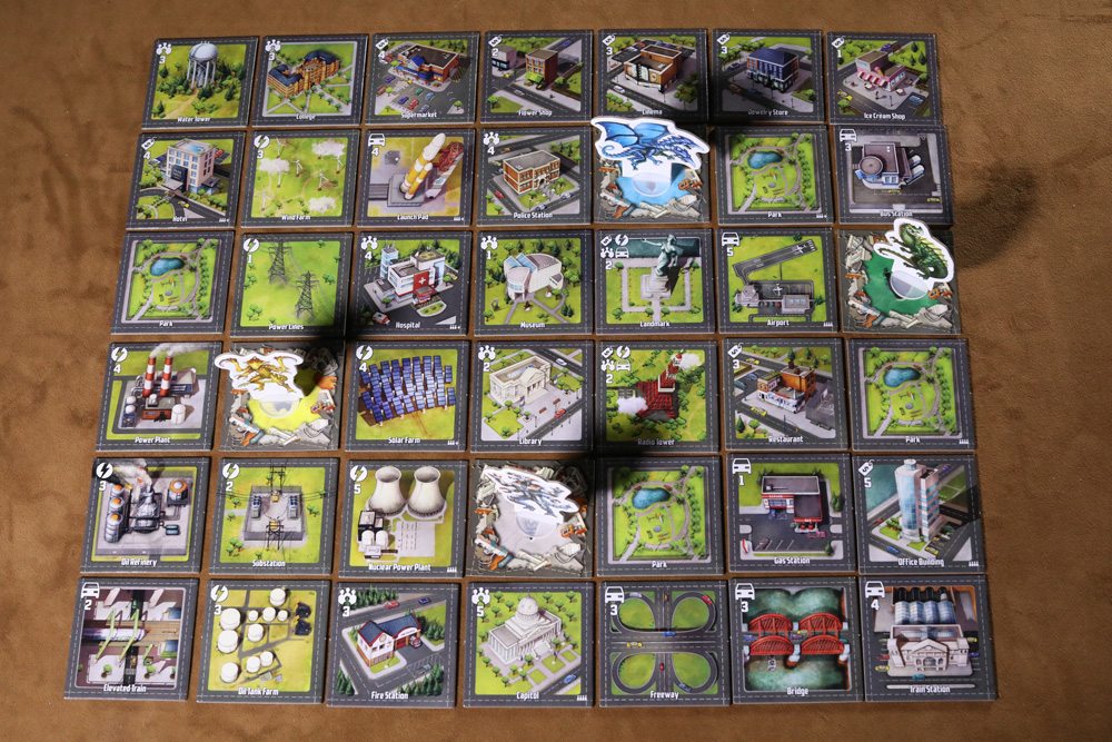Finally, there are the city tiles, representing your fine city (which you’re about to destroy). City tiles are divided into four categories, mostly. There are community tiles, which are things like a capitol, library, water tower, and hospital. The commercial tiles have things like a restaurant, cinema, hotel, and supermarket. Transportation tiles have a freeway, bridge, gas station, and even a launch pad. Then there are the power tiles. There, you’ll find a solar farm, wind farm, oil refinery, and substation.
