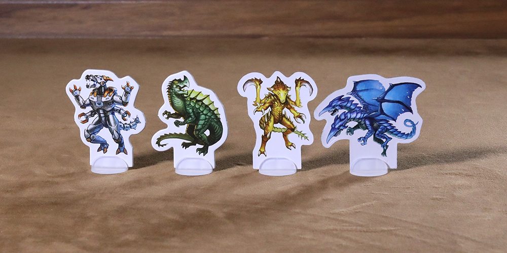 The four monsters are a variety of beasts you’ve seen on the big screen — and some you haven’t. There’s Galithor, an aggressive reptile who has recently emerged from a dormant volcano. There’s Mecha Kaizer, a robotic creature with six legs and constructed of unknown materials. Draximus is a two-headed dragon who first appeared after a toxic waste spill. Finally, there’s Steganox, an insect-dinosaur who mysteriously appeared after a UFO sighting. The standees for each monster are great and the monster tiles are color coded to the monster and also have a reminder for combat resolution printed on them.