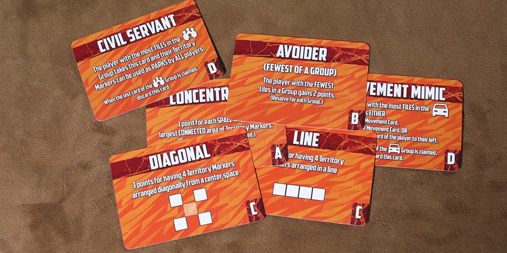 When the game ends, points are tallied. First, players count the value of each city tile in a simple summation. Next, players evaluate the objective cards. The A objective awards a point for each space on your largest controlled territory, the A card pays a point for each distinct area you control (yes, a single marker counts as an area). The B objective awards for either the most tiles in a category group or the fewest in that group, depending on the side of the card you chose. The objectives marked C give points based on the shape of areas you control — lines, squares, diagonals, or orthogonals.