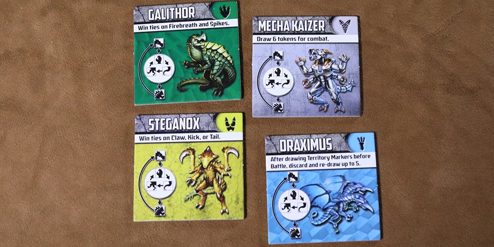 Fighting is done in a rock, paper, scissors style, with a kaiju twist. When a battle is inevitable, each fighting player draws 5 territory markers from their draw piles. They look at their cards, make some boasts or bluffs and then play a card. The icons in the game are easy to look at to determine the winner, but claw beats tail, tail beats kick, and kick beats claw. However, firebreath beats all of those. However, again, spikes beat firebreath. And all three, claw, kick, and tail, beat spikes. Really, just look at your player tile. It’s simple. Rounds are resolved one by one and most wins earns that battle victory.