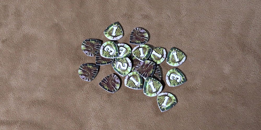 The combat victory tokens are cardboard and look a little like small guitar picks. I’m not sure what they are meant to be, but one side is blank, just cracked and distressed. The other side has a value on it, 1, 2, or 3. There are a dozen ones, 5 twos, and 3 threes.