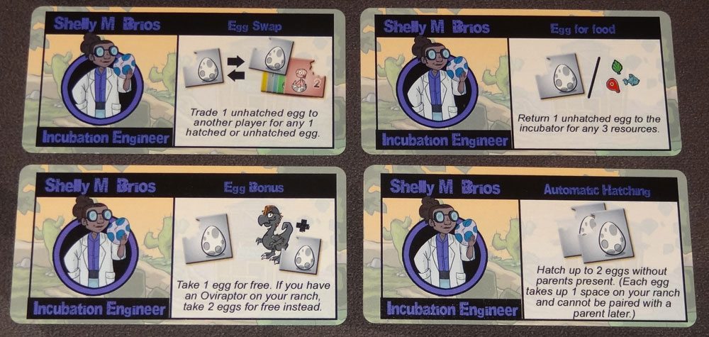 The oviraptors are a new dinosaur tile that get mixed into the rest of the dinosaur tiles—more on those in the “how to play” section. The new hired hands cards feature Shelley M. Brios (punny, like the hired hands cards in the base game) and have to do with eggs. The hired hands cards are a strange proportion—like half a standard card lengthwise, so they’re long and skinny. I’m not sure why that decision was made for the original game, but the new cards are the same size, of course.