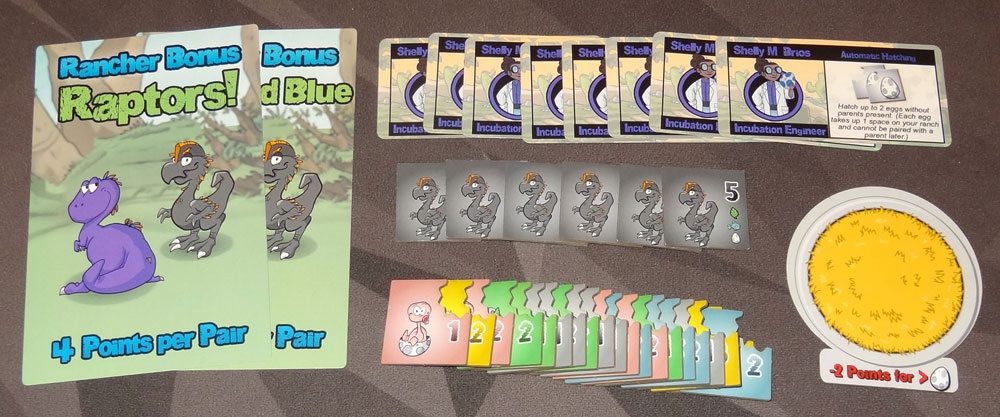 During setup, add the oviraptor tiles to the bag, and shuffle the new hired hands cards into the deck. Put the new rancher bonus cards into the deck before dealing one to each player. Put the incubator tile next to the Jurassic Hunting Grounds board. Shuffle the egg tiles and place them (egg side up) on the incubator tile.