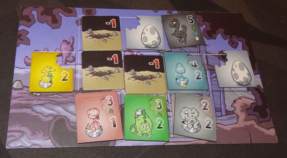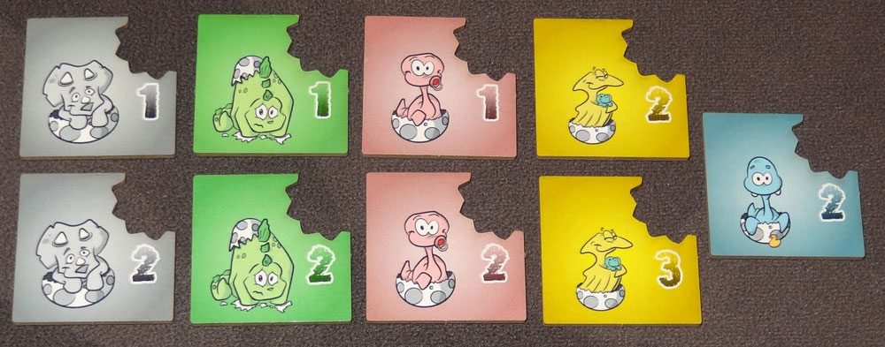 The egg tiles are the same size as the dinosaur tiles, but with a cut-out in one corner. The back shows an egg, and the front shows a baby hatchling. When placed on top of a dinosaur tile, the point value of the tile below shows through the cut-out, with the hatchling’s point value shown lower. The hatchling art is pretty cute, showing a cartoony dinosaur emerging from eggshell pieces.