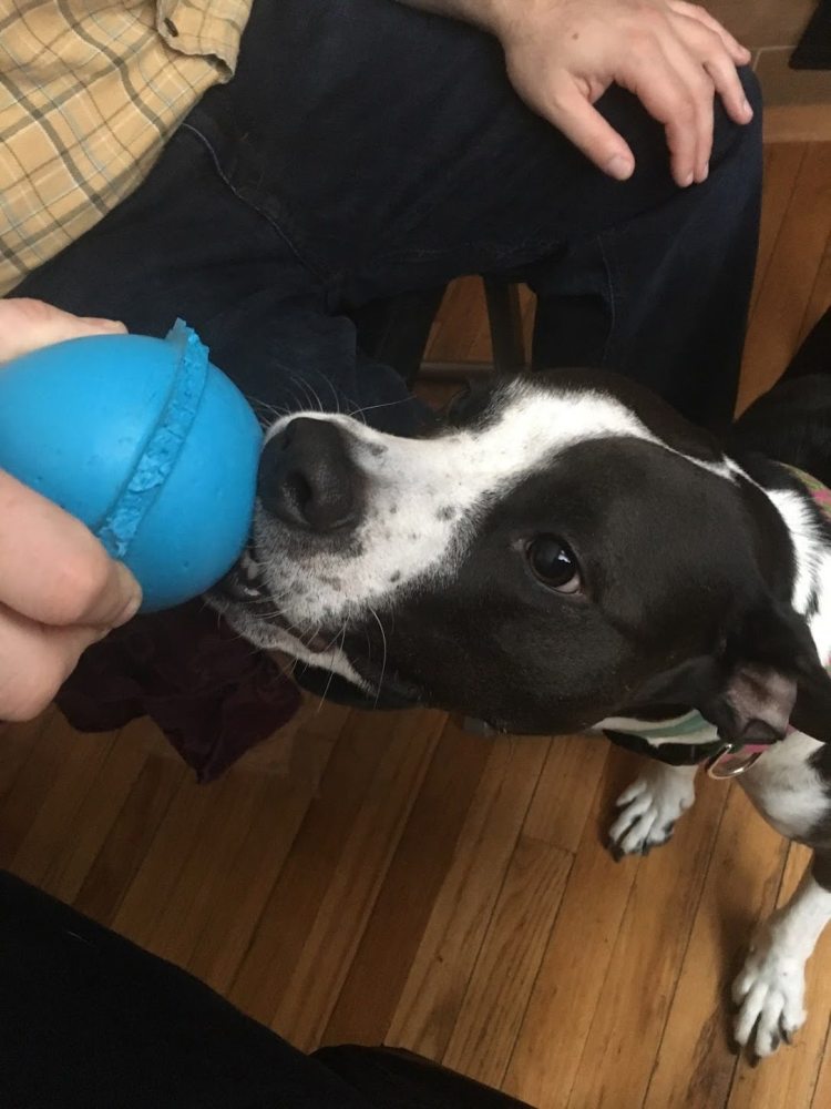 She also didn’t seem all that interested in the asteroid, but that’s because she’s more a tugger than a fetcher. The ring toy seemed like it would be a good choice for her, but she chewed the ring off, making it yet another ball.