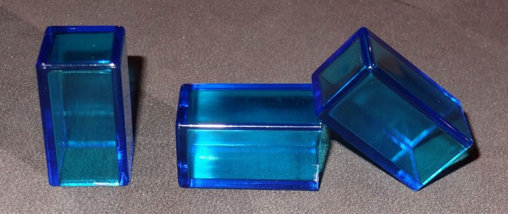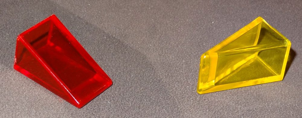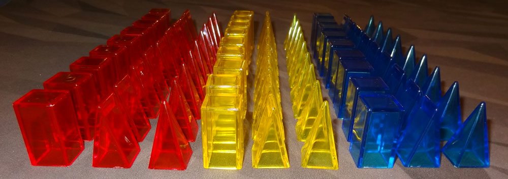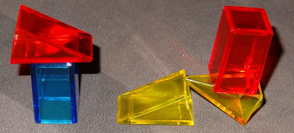 The pyramids are almost identical to the largest size of Looney Pyramids (as seen in the Pyramid Arcade): translucent plastic, four-sided, and without a base so that they can be nested. The only difference is that they don’t have the pips on the side that mark the three different sizes of Looney Pyramids—in Zendo, there is only the one size. The wedges and blocks, new to this edition, are similarly constructed: they have the same height and same open square base as the pyramids. Wedges are triangular prisms, and blocks are rectangular prisms. The pieces come in red, blue, and yellow.