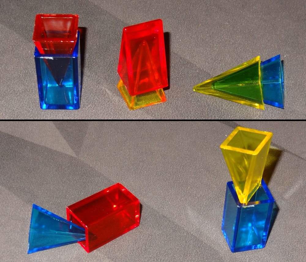 Top: Pyramids can be nested inside blocks, wedges, or pyramids. Bottom: Any piece that extends into a base is “inside” that piece. Photo: Jonathan H. Liu