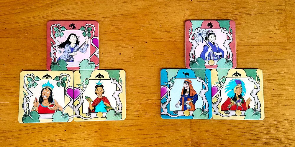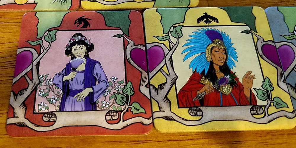 Scoring is fairly straightforward. Each player compares their tree to the players to their immediate left and right. They get one Dynasty Token for each dynasty where they have a longer vertical chain than their opponent. So, for each family, it’s possible to get up to two tokens per round. In the case of a tie, neither player gets points.