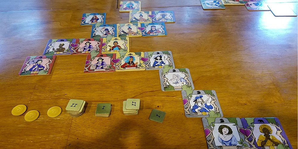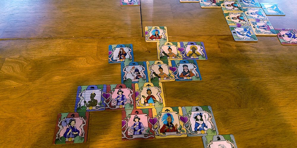 The different tiles pose interesting challenges when playing. You need to be careful to not play tiles that will make future connections difficult. For example, while there are equal numbers of tiles with hearts on the right and the left, you of course aren’t guaranteed to get the ones you need, but you may have to play a tile as a sibling instead of a spouse because you can’t get the correct heart. However, marriages are more valuable due to the end-game bonus. The tiles with no leaves on the bottom are particularly challenging to play.