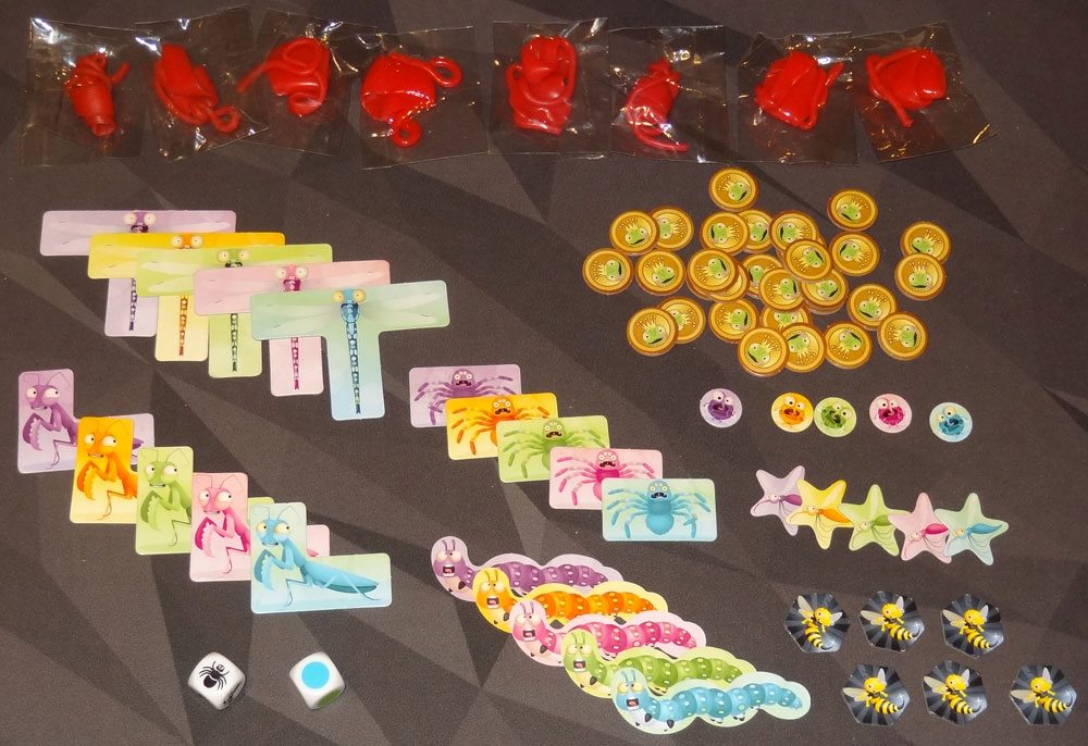 The dice are rounded plastic dice: one has six different bug icons, and the other has colored dots on it. I found it a little odd that, since there are only 5 colors of bugs, that the green is repeated and appears twice on the die, which means that you don’t have an equal chance of rolling each color. I do wonder why they didn’t just go with 6 colors, or else have a “wild” color.