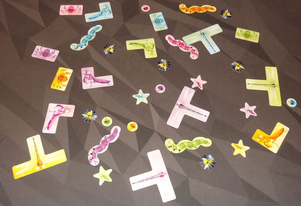 Give each player a sticky tongue. Scatter all the insect tokens and wasp tokens randomly on the table, making sure that they don’t overlap each other, and ensuring that the wasps aren’t clumped up in one area. Set the stack of yummy tokens aside—I would recommend somewhere entirely separate, like on a chair. And speaking of chairs, you probably want to push them back as well because this is the sort of game where you probably want to be standing.