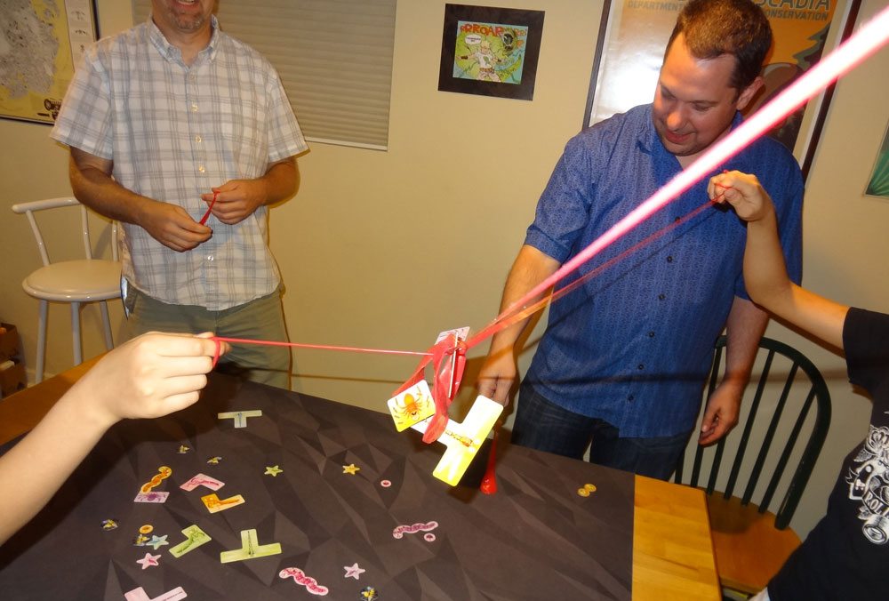 Sticky Chameleons is exactly what you expect from the description: it’s silly and chaotic fun, and (for adults especially) it can also be somewhat exhausting. As soon as the dice are rolled, it’s madness until somebody manages to get the right bug and slap it down on the table. The rule that you can continue trying to catch the bug even if it’s on somebody else’s tongue means that you get a lot of tangled tongues—and that if you snag the plumpest insect, suddenly you’ll have a lot of sticky tongues flung at you. Grabbing the insect off your tongue and putting it back on the table can be quite a challenge when your tongue is getting caught and pulled in all directions. (Fortunately it’s not too difficult to separate the tongues back out.)