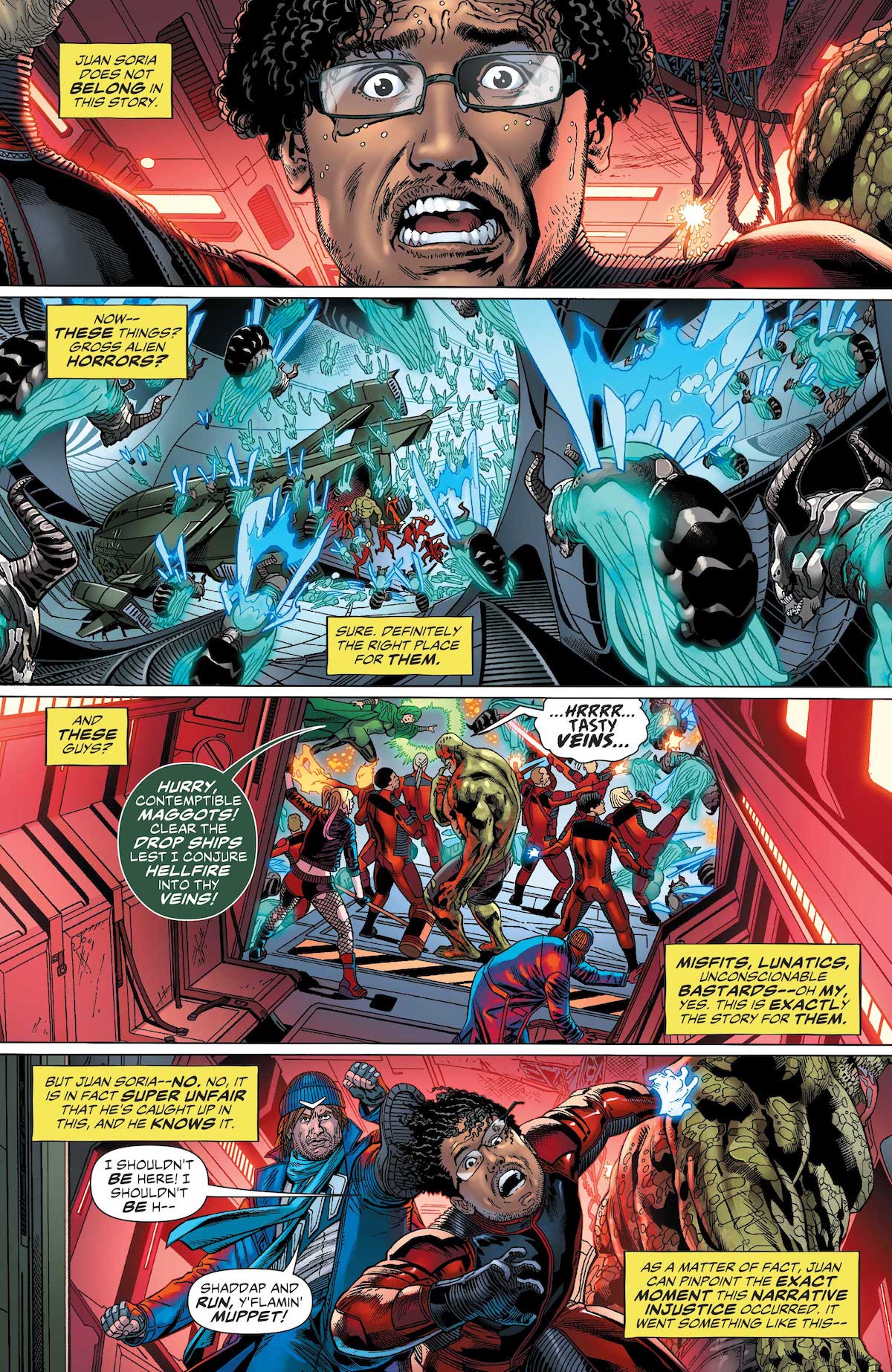 This issue is clearly influenced by Ostrander, who – unlike the current movie-focused team – frequently brought in new members who rarely lasted past their first few missions. This issue focuses on one such unfortunate, a young man named Juan Soria. A low-level metahuman – the nanites in his hand allow him to unlock any lock – he grew up as an immigrant idolizing the Justice League. After he got his powers, he applied for membership (in a segment that feels like a bit of unreliable narrator) and was rejected. Struggling to make ends meet, he turned to petty crime, and after being arrested he was sent to Belle Reve – where he was eventually gang-pressed into the Suicide Squad.