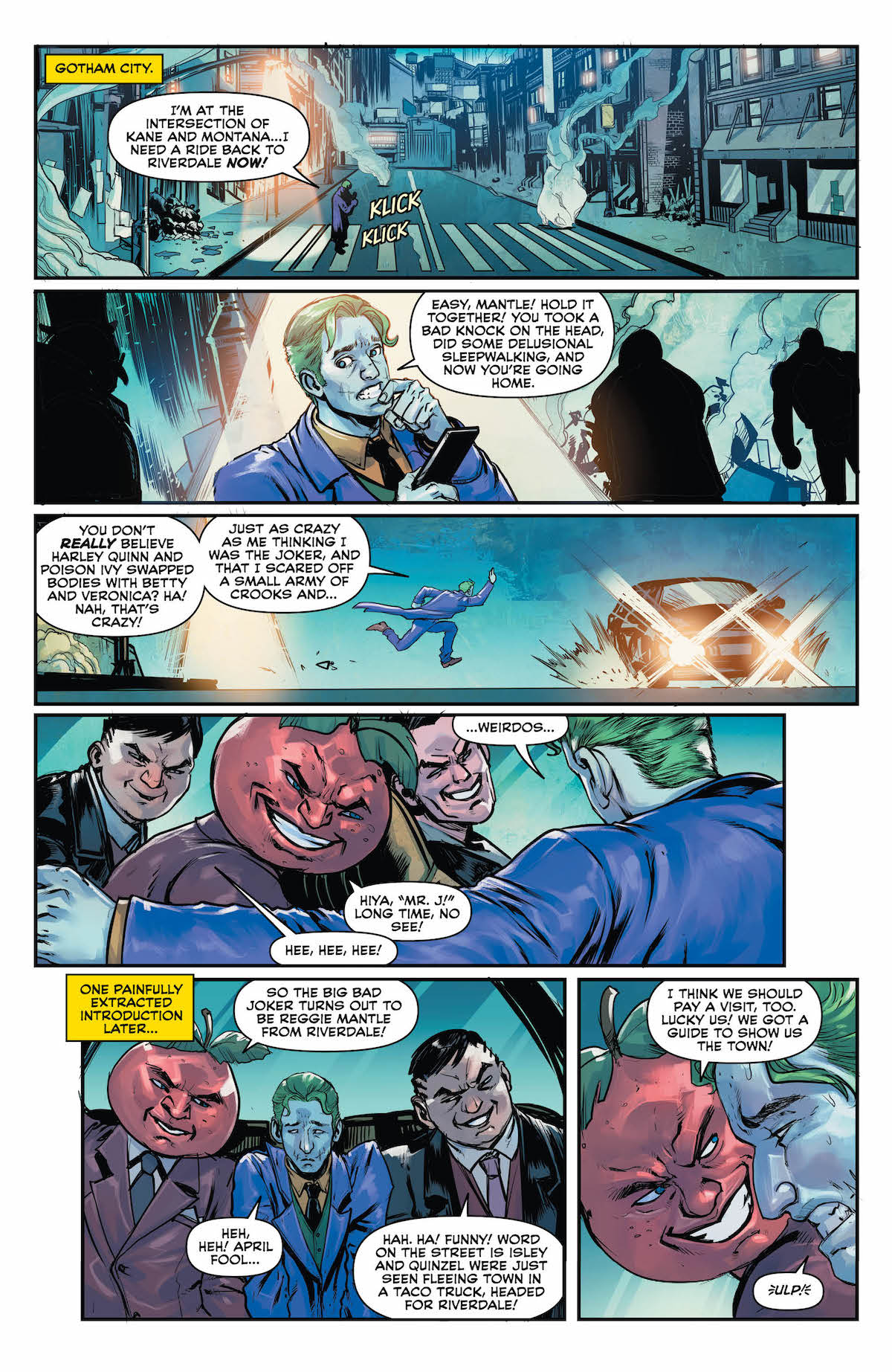 Lenny the Lamprey. Tomato Head dude. Reggie pretending to be the Joker. The double- and triple-crosses. They’re all great fun. I’m glad this book didn’t go down quite as dark a path as it could have, though there’s enough Gotham in the Riverdale setting to satisfy Harley fans.