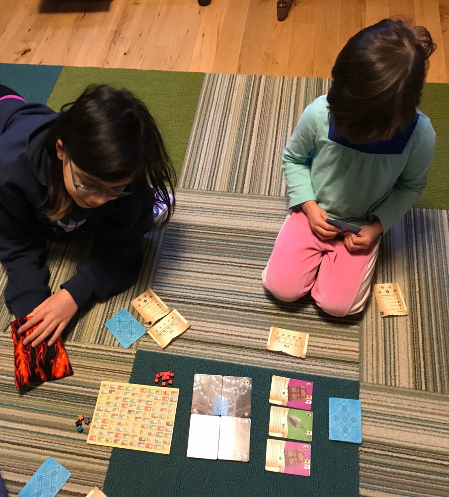 It works well for adults, too. I like the turn order cards, because it adds another element of choice to the game: Going first in a round is the riskiest, because there’s only one safe space on the card, but you can also earn a lot of bravery points if you make it back out with a lot of books. Going last gives you the most safe spaces, but not as many bravery points. One interesting twist is that if you go later, you might earn more points per book because previous players have burned some and made them more valuable! On the other hand, if too many books burn, you might not get a turn at all.