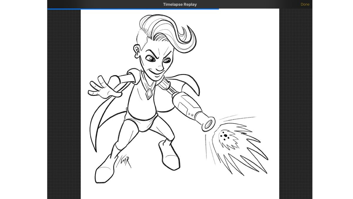 In this image, you can see Kurt’s linework for the sketch. Don’t worry, the progress is all shown in the course; this is just a snapshot. Procreate has a feature which records a time-lapse video of your drawing, and Kurt provides the original image as part of the course. I have found this terribly useful, and have spent (and am still spending) a lot of time in this area of the course. Not only is it fascinating to see the progress, it gives insight into how Kurt finalizes his lines.