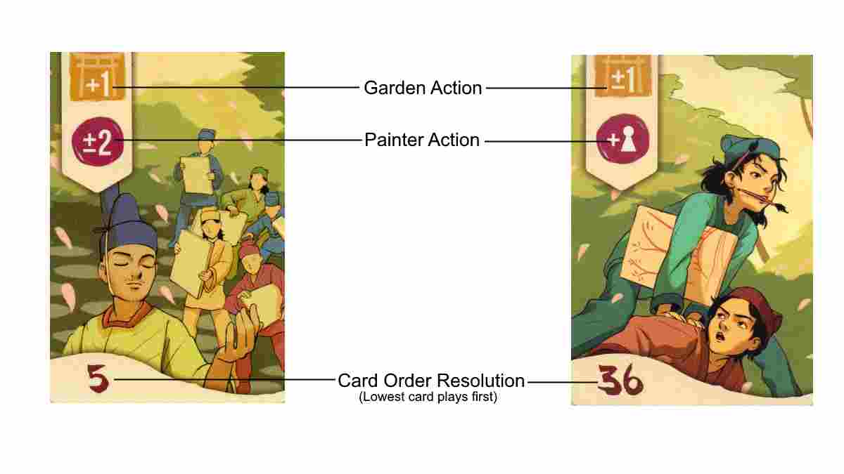 The components themselves are of good quality. The pawns are a nice size, with the emperor standing taller than his painters, as one might expect. The cards are smooth on both sides and made from good card stock. Both sides of the cards have pleasing faces. The Japanese style flower picture on the reverse side is a nice touch and the thematic “competitive painters” aesthetic of the playing faces are appealing, adding to Sakura’s quirky flavor.