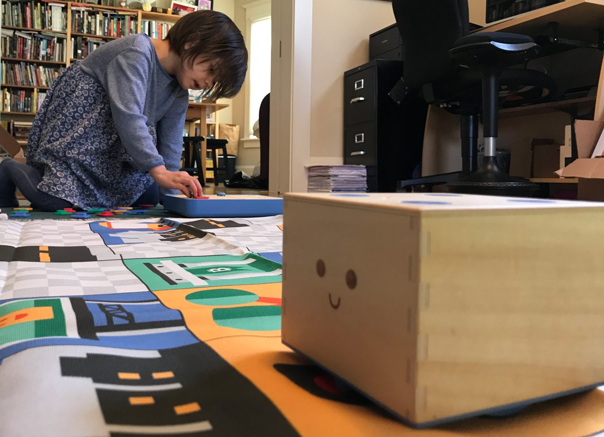 Cubetto is two years old! This little robot teaches preschoolers how to program in a Logo-style language without a screen. Kids use programming blocks plugged into a special base to make Cubetto turn and move. There are a variety of colorful canvas maps with different themes—city, ocean, space, and so on—each with a little booklet that tells a story that gives Cubetto specific destinations to visit along the way.