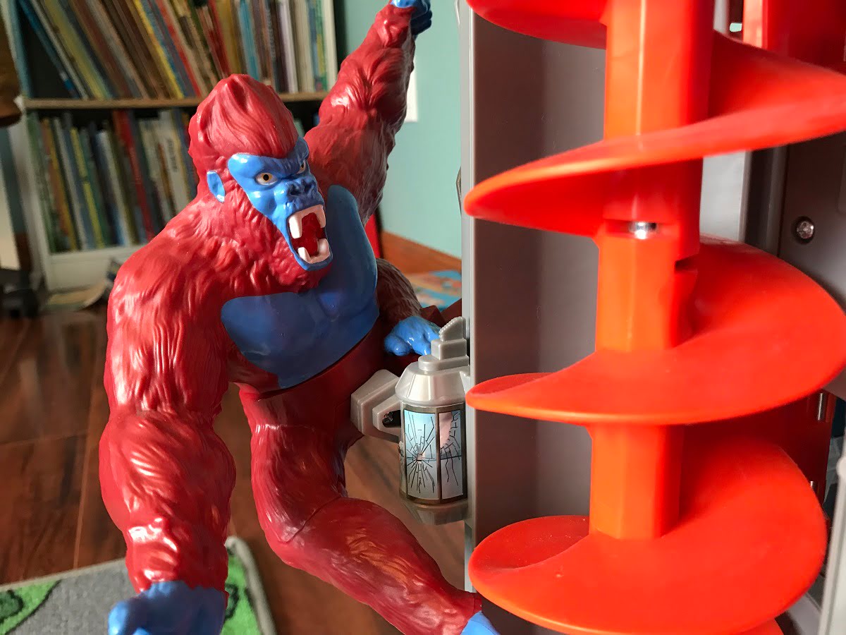 Also, we fail to see the point of the huge gorilla. It climbs to the top while the elevator is running, pretending to swat at and grab the cars, and after it reaches the top, it crashes down to the bottom. Loud. Obnoxious.