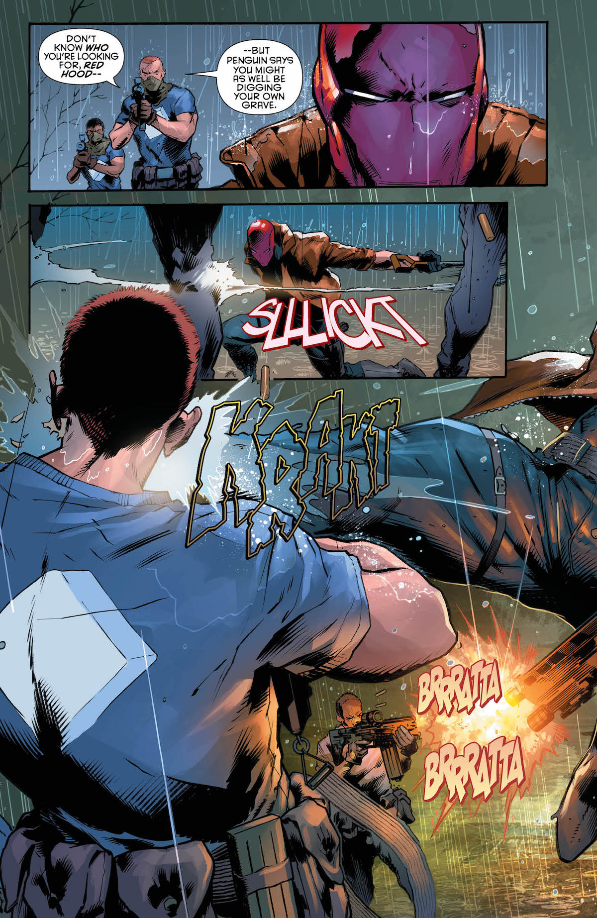 After an opening segment where Jason takes on an army of Penguin’s goons with only a segment, the story flashes back to Ma Gunn’s house. There, Jason finds a series of letters from his father, written from jail and trying to tell Jason the truth about his abandonment of the family – from, Jason thinks, beyond the grave. Willis Todd tells the story of how he was a low-level drug dealer who sold one day to a girl from a good family and became infatuated with her. He won her over, but the possibility of a relationship between them was rejected by her family. They ran off together, lived in a flophouse, and struggled with drug abuse – until Catherine became pregnant, and they decided to try to clean up.