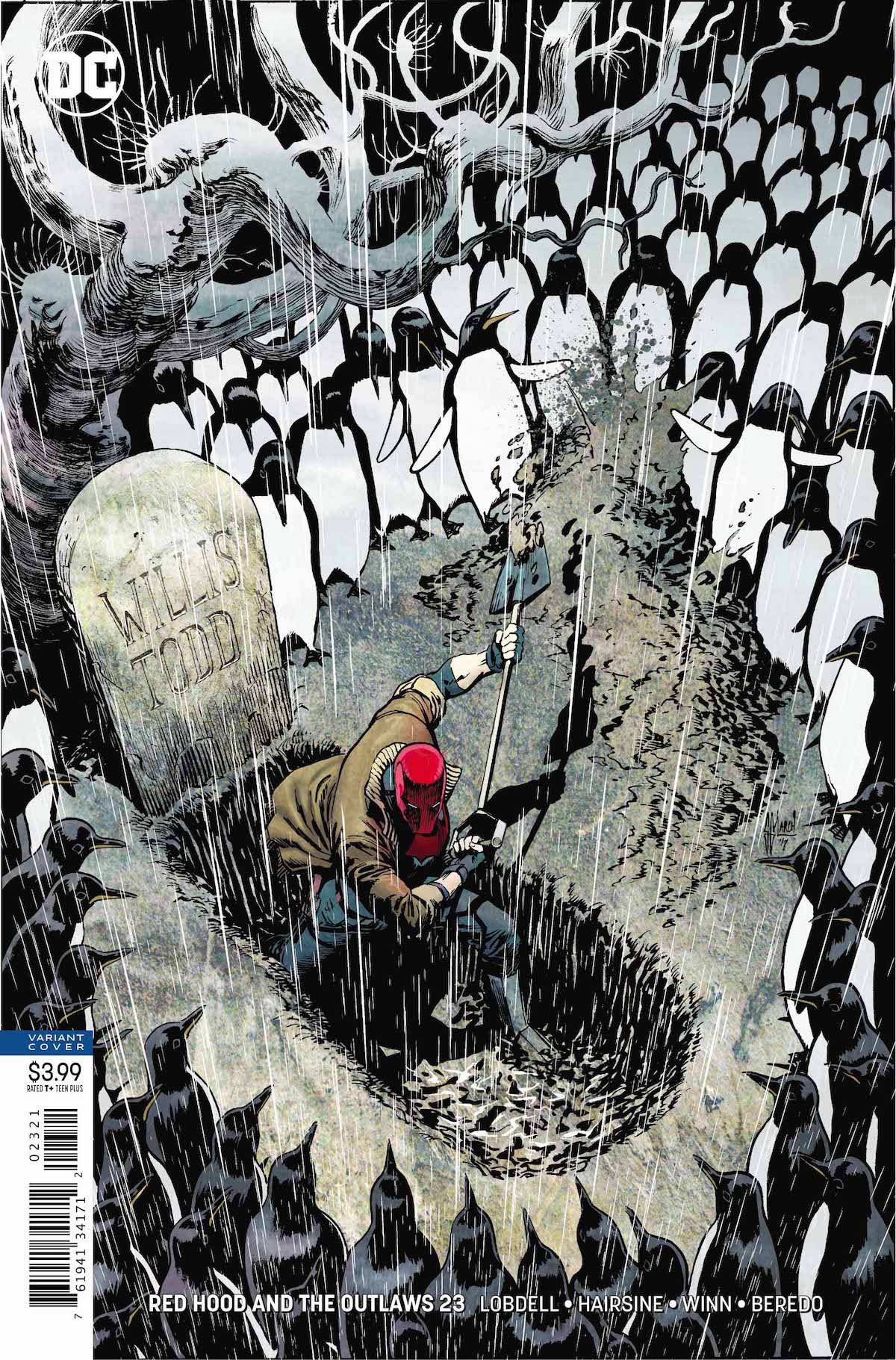 Trevor Hairsine jumps on board Red Hood and the Outlaws to do some rare interior work for him, but he’s not getting to draw all the Outlaws. Artemis and Bizarro take the issue off for a gritty story focusing entirely on Red Hood and taking the story back to his early childhood.