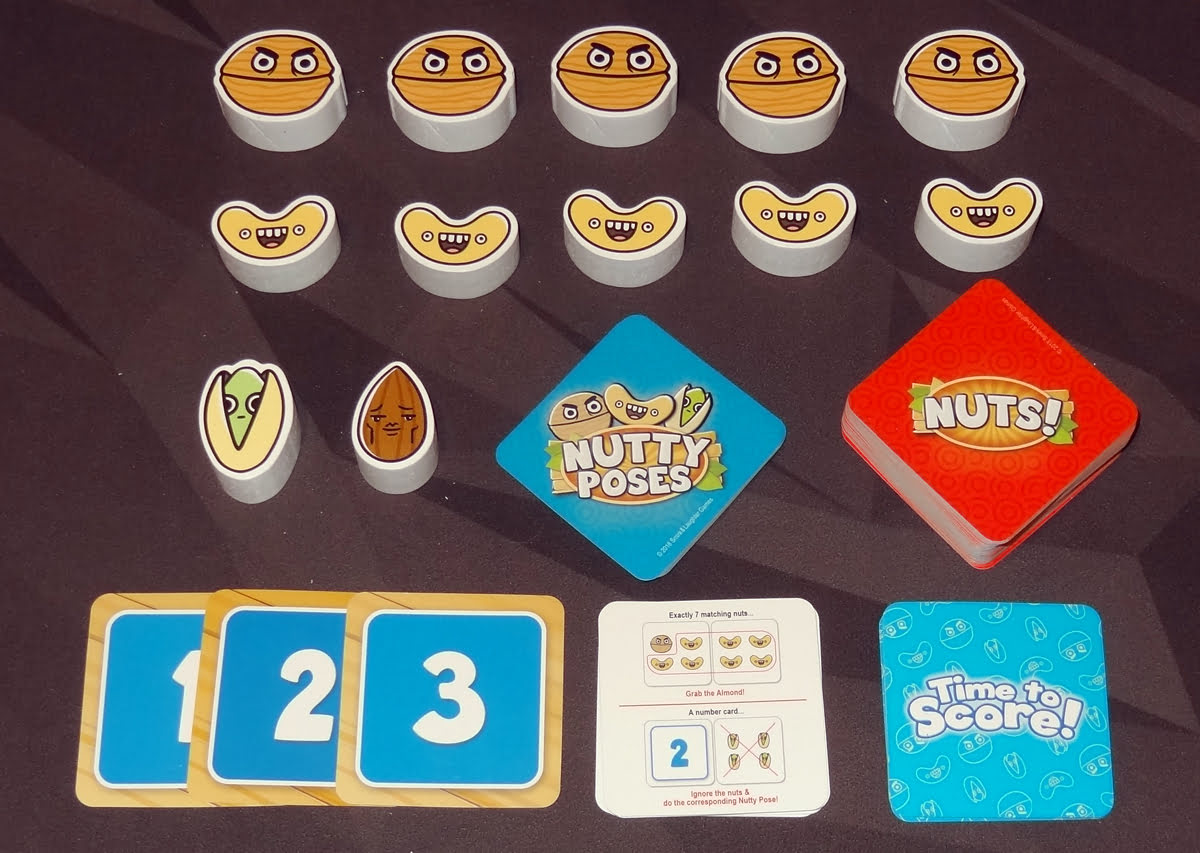 Nut So Fast is all about quick observation and speedy reflexes. You need to count quickly and then grab the right nut before somebody else does, or else you’ll end up scoring points. Part of the trick is being able to shift gears quickly, from “4 of a kind” to “oh, that’s two sets of 4 of a kind” to “wait, I need to do a pose!” It’s silly fun to play, or even just to watch other people play.
