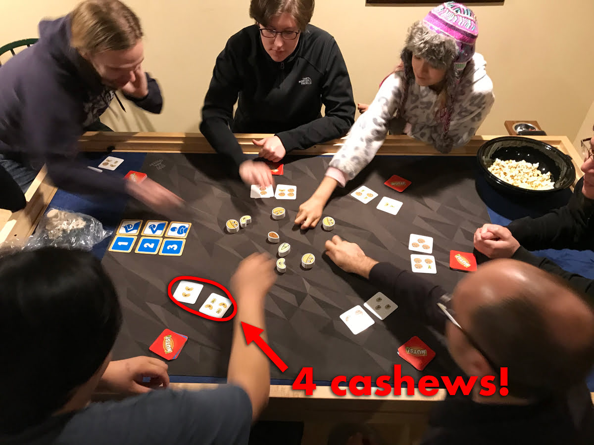 The almond in particular is a rare case but really powerful, since it cancels out all of your points for the round up to that point, but since the almond itself isn’t pictured on the cards, it’s easy to forget about it while you’re counting up walnuts, cashews, and pistachios.
