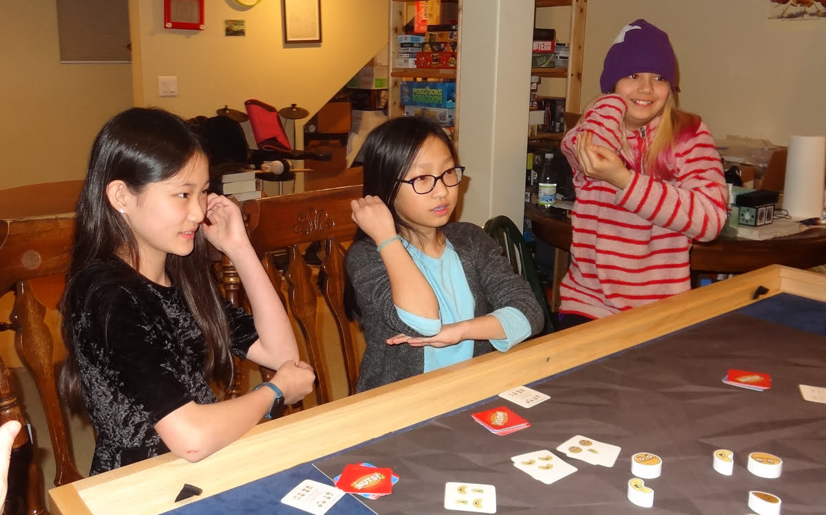 I would generally recommend playing this on a round or square table, rather than the long rectangular table you see pictured above, simply because the people sitting on the ends are at a disadvantage, but we typically put the adults there and had the kids sit closer to the center. Also: watch out for sharp fingernails and rings!