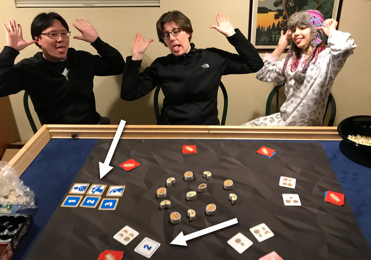 Note that everyone is only allowed to use one hand for flipping cards and grabbing nuts—and if it’s not your turn to flip a card, you’re supposed to keep your hand near your cards rather than hovering over the center of the table.