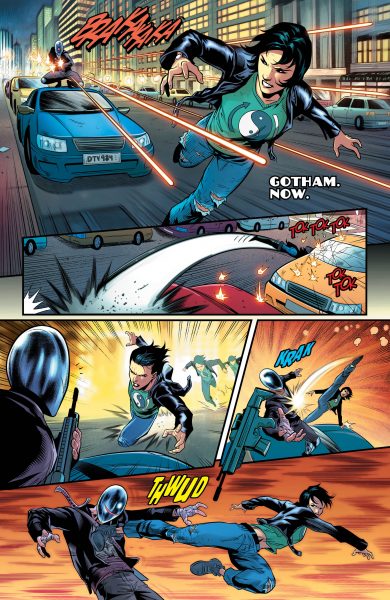 I was instantly predisposed to love this issue, because it stars Cassandra Cain in full-on kick-butt mode. Last issue saw her get knocked off her bike and stared down by the rifle-toting villain, but she wastes no time fighting back. Unlike Duke, who’s still a rookie and got taken by surprise (although the epilogue this issue makes it look like he’ll be back in the action next issue), Cass is able to give Karma as good as she gets, even when her arm gets broken by the masked villain. Black Lightning, recruited by Batman early in the issue, joins the fray, and eventually Batman himself. As good as the action is, though, it feels almost secondary to Hill’s whip-smart dialogue as Jefferson Pierce winds up getting fully inducted into the Bat-family as one of Bruce’s official secret-keepers. The respect and tension between the two heroes is great – it’s about time Batman had someone who respects him, but is not afraid to call him on the carpet for his failures. As for the last panel, I’m sure it’ll have a lot of people debating, but what I took out of it is this – Batman is scared of Karma, more scared than he has been of a villain in a very long time. What that means, and what twists Hill has planned for us, I can’t wait to find out.