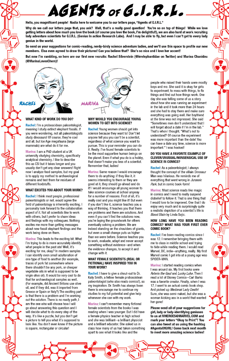 First of all, that was an idea Elsa and I came up with together. She had originally wanted to do a tumblr of historic women scientists that ran alongside the book to promote the book. However, knowing that I had friends who were scientists, I thought it made a lot more sense to profile them. It’s easy to research Marie Curie, but there’s not really a feeling for me that any girl reading a comic book in 2018 can just be her. I wanted to focus on women who were doing science right this moment and who young girls could actually reach out and talk to if they wanted to. I asked Alanna and Tom (Brevoort) if we could scrap the usual letters page and give this space to these profiles and they were only too happy to go with it. We wanted to make sure that if we were saying “we promote women in STEM in this comic” we weren’t just talking about “super-science” but that we provided this link between the far-fetched stuff in the comic and the real possibility of working for NASA that a girl in middle school right now might have.