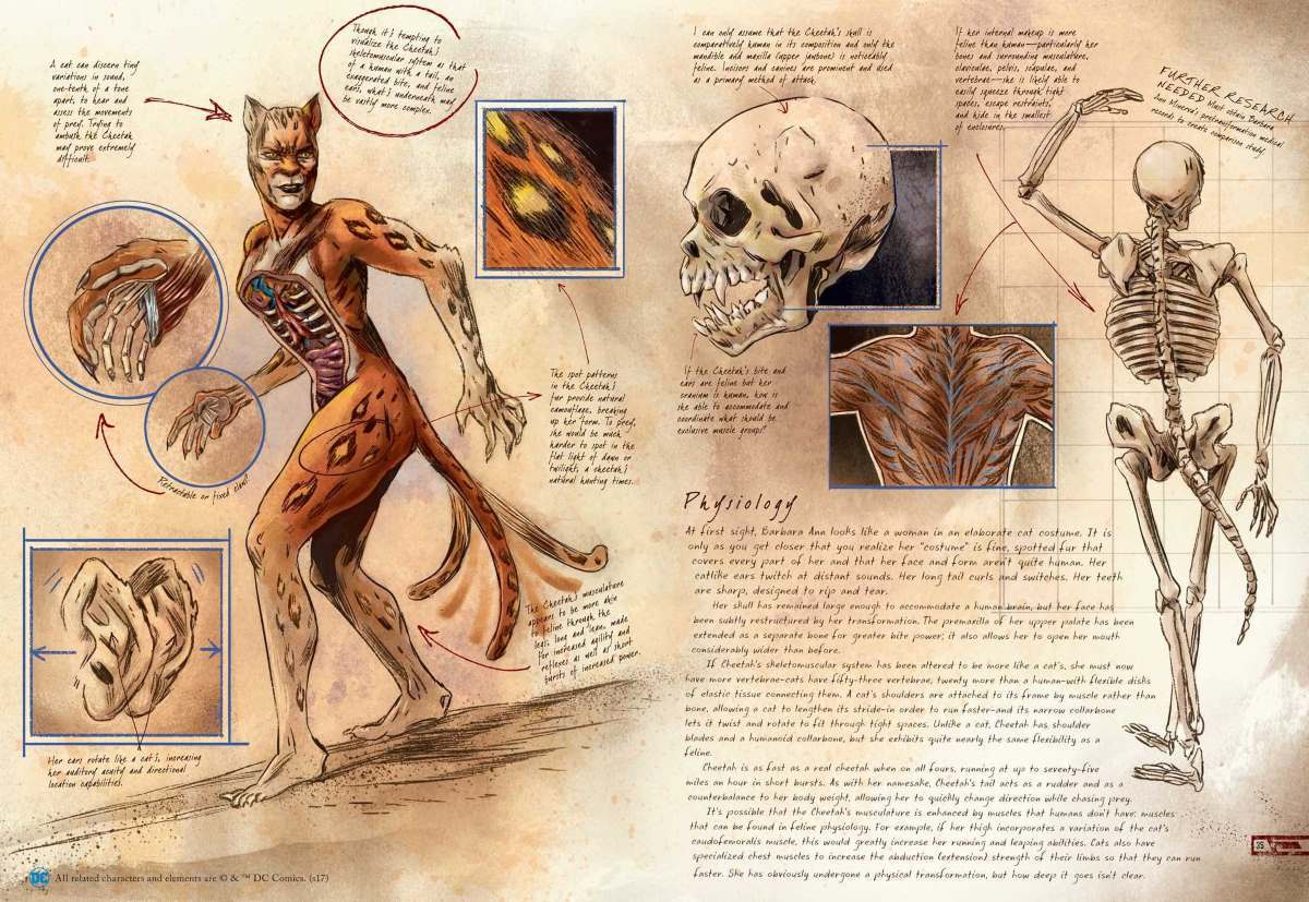 A fully illustrated guide that shows some of DC’s metahuman powers might actually work. It covers many (but not all) of Batman’s allies and adversaries, stripping down their powers and analyzing them in a (mostly) scientific fashion. The text is written using a handwriting font and sits alongside Ming Doyle’s hand-drawn, Da Vinci-esque anatomical illustrations.