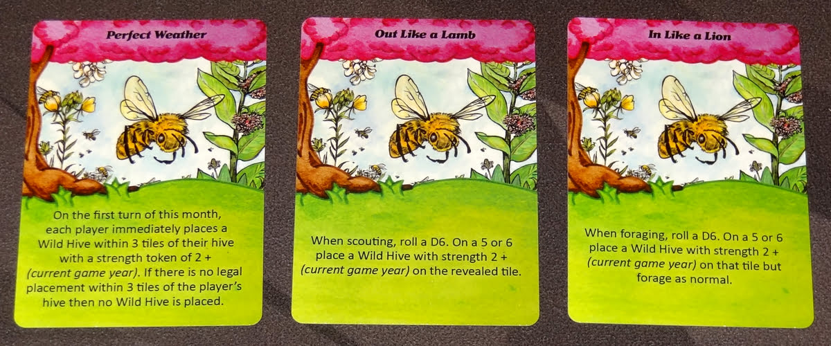 The tiles provide different resource depending on the season, so it’s important to do a little bit of scouting, where you hope to have a variety of tiles within foraging distance of your hive. The wet tiles always provide 1 honey, 1 forage, and 3 water, which is needed for cooling down your hive when overheating is in effect. But the other three tiles will vary based on the season. Events may also affect the amounts harvested, and there are plenty of events that reduce resources by 1 … which means some tiles will provide no honey or pollen at all.