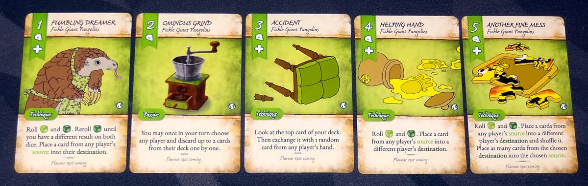 Each Dale of Merchants set has one animal that uses a die; the Fickle Great Pangolins have two dice. Each one has sides representing a player’s hand, deck, and discard pile; the lighter die is the “source” and the darker die is the “destination.” The Pangolin cards allow you to move cards from a source to a destination, sometimes between two different players, though there’s a lot of randomness involved.