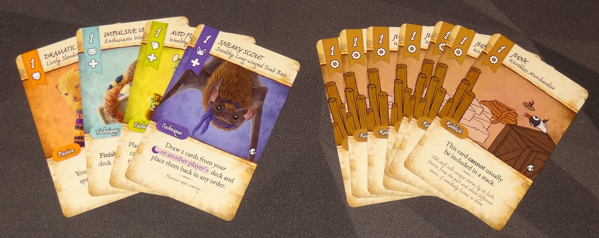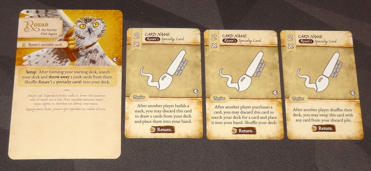 For instance, Rozan has three specialty cards that are shuffled into your starting deck. These cards have a value of 2 and can be spent to pay for things as usual, but they also have passive effects: if another player builds a stack, buys a card, or shuffles their deck, you can get a bonus if you have the right specialty card in hand at the time.