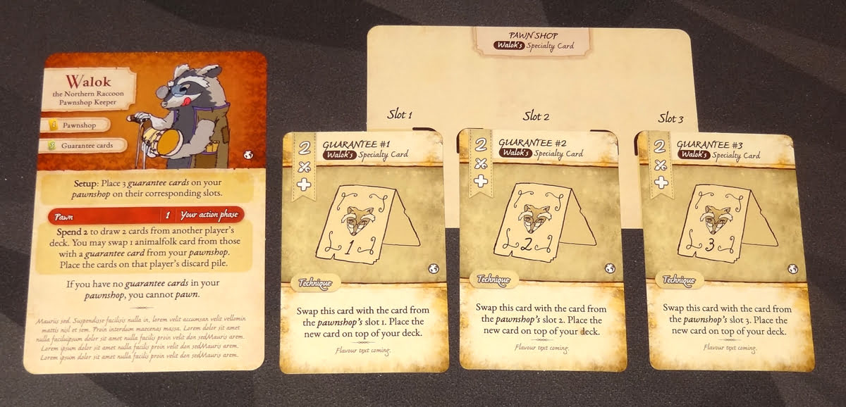 Walok, on the other hand, is a bit of a trickster. He has a pawn shop with three slots that start with his three guarantee cards. Once per turn, he may spend 2 to draw cards from another player’s deck, and put one of them into his pawn shop, giving that player the guarantee card instead. That player has the option of trading it back once they draw the guarantee card—or they might just use the card’s 2 value to pay for things instead, leaving their card in the pawn shop for later.