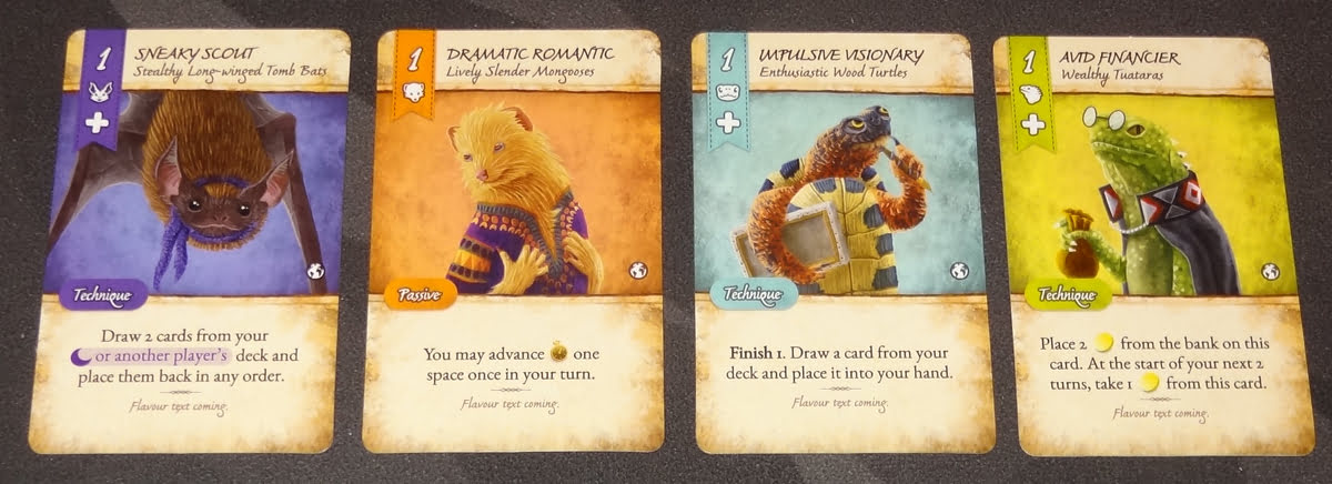 First, choose which animalfolk will be used in the game; you use one more set than there are players (so a 4-player game will use 5 animal sets). Set aside the “1” cards from each animal (the ones with the portraits) and shuffle the rest of the animalfolk cards together to form the market deck, revealing the top five cards onto the market board.