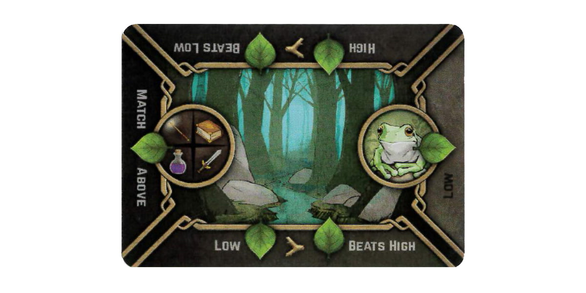 - Right: While the other three sides of all eighteen Encounter Cards included in the game are always the same, the right side of each one presents a unique win condition. For instance, the condition might state that the highest squirrel card wins, or that the lowest potion card wins. Each player may play one card at this location, face-down. The cards are then revealed at the end of the encounter and the one that matches the condition scores 6 points. If there is a tie, then the player in second place (if any) scores 6 points.