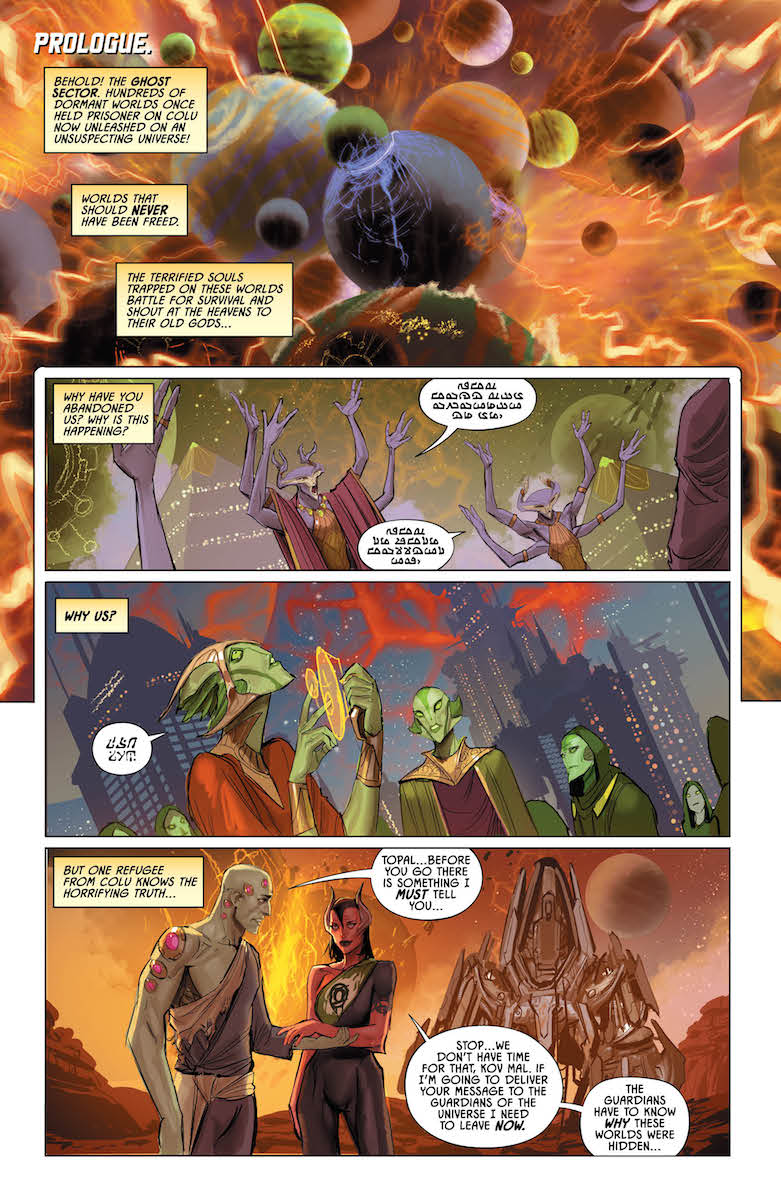 So after all that, how is it doing? The early answer is decently. This is an intriguing cosmic adventure with a tight cast of misfit characters. The issue opens with Jessica Cruz flying through space, on an extended solo mission to map the Ghost Sector, the new area of space opened up by the Dark Multiverse in Dark Knights: Metal. We get glimpses of the new lifeforms in this world, some on a hopeless mission to escape and get a message to the Green Lantern Corps. Jessica is struggling with being isolated in deep space, making do with temporary contact with Simon on Earth. However, her exploration is interrupted with Brainiac’s ship plows through the Ghost Sector – carrying a trio of Earth heroes. Turns out the GLC aren’t the only ones who want to map the sector.