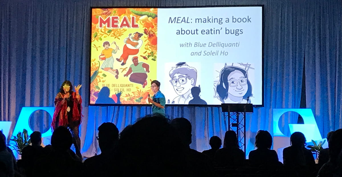 The creators of Meal, Blue Delliquanti and Soleil Ho, gave a talk at XOXO’s comics track, and they really dug into the subject of entomophagy and how this book came about. There’s a section after the story ends where Ho outlines her own experiences eating insects and some of the complicated politics that surround the topic. Insects are marketed now as a superfood, as a protein source that’s more environmentally sustainable than meats, but it’s often either sterilized to remove its insect origins or made into a novelty that highlights how weird it is.
