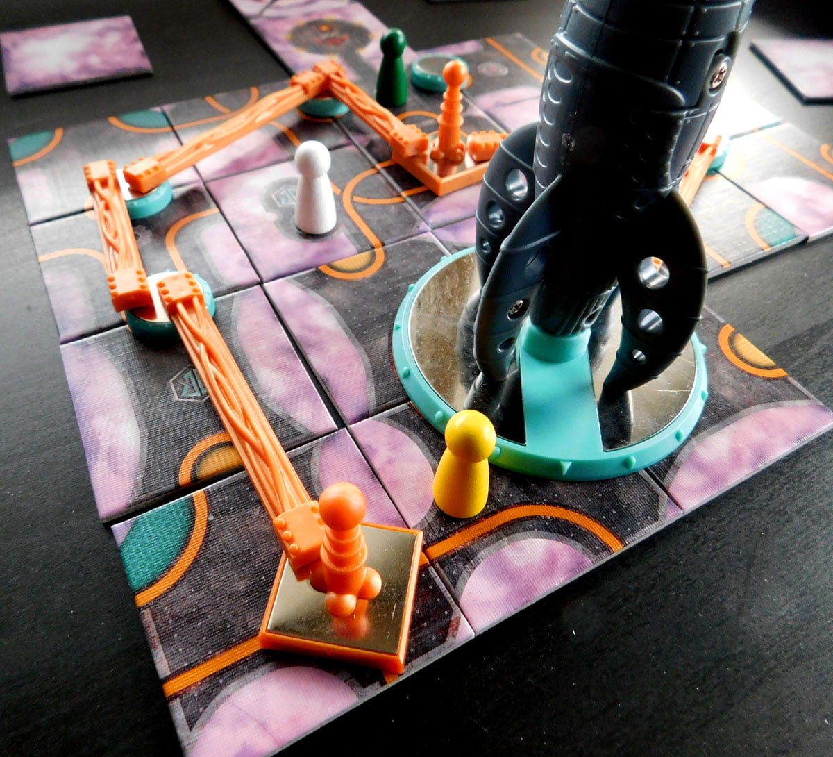 To wire you will place any available wire piece from the game’s reserve on to two components (any combination of capacitors, lightning rods, or the launch pad), at least one of which is partially on the tile your pawn is located on. Wiring is, ultimately, how you will create a complete circuit around your launchpad and rocket.