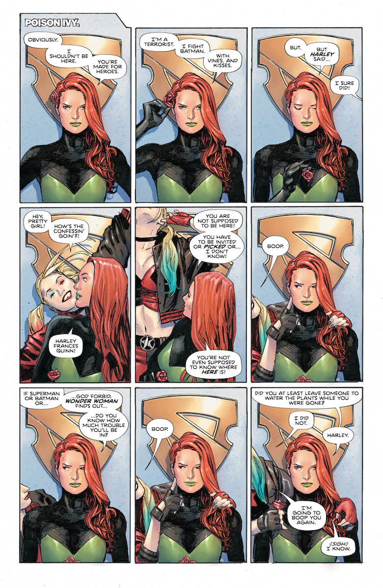 And, to pile on insult, Harley seems to equate loving Ivy as a mistake, on par with loving the Joker, at the end of the issue. I suppose it’s a fake-out to get the reader to believe Harley might have killed Ivy, but equating an anti-hero like Ivy to the murderous Joker, and comparing the consensual and supportive relationship between Ivy and Harley to Harley and the Joker is a serious misreading of the Harley/Ivy relationship.