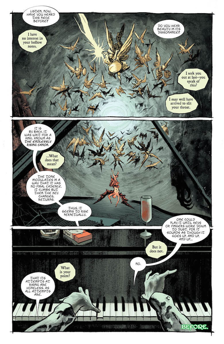 There was also much to parse in the tale of the powerless Lucifer without his wings, not the least of which because it featured background images of Blues legend Robert Johnson, who supposedly sold his soul to the devil at the crossroads, and Hitler himself. (And a few others who I’m sure some readers will recognize.) The hint is that this is Lucifer’s hell and he can never climb out.