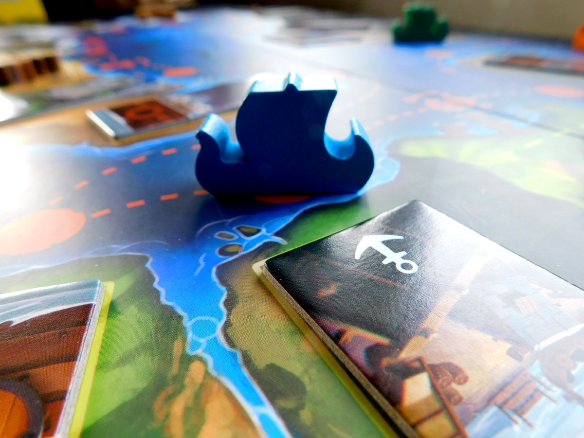 Player order is randomly chosen, with their wooden ship tokens being slotted into the starting dock in a row. Then, as will be a pattern for the rest of the game, the player who’s farthest back takes their turn first and advances their ship as far along the board as they want.