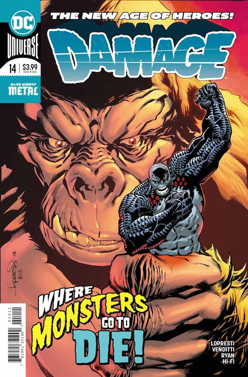 How good can a comic be when it barely has a plot? That seems to be the question Damage wants to answer, because we’re two issues away from the end and it still barely feels like we know Ethan Avery and his monster alter ego at all. Each issue has largely been Ethan/Damage ping-ponging from one threat to another, running away from it as Ethan and running towards it as the monster. But Damage #14 is marginally better than the average because the threat is at least entertaining. When we last left off, Damage had been dropped by Batman on Monster Island, a little-used DC location from the Silver Age filled with giant monsters and the occasional mad scientist. Naturally, he wastes zero time angering a giant purple dragon and winds up in a massive brawl with it. The first half of the issue is largely an elaborate, gorgeously-drawn brawl between these two monsters.